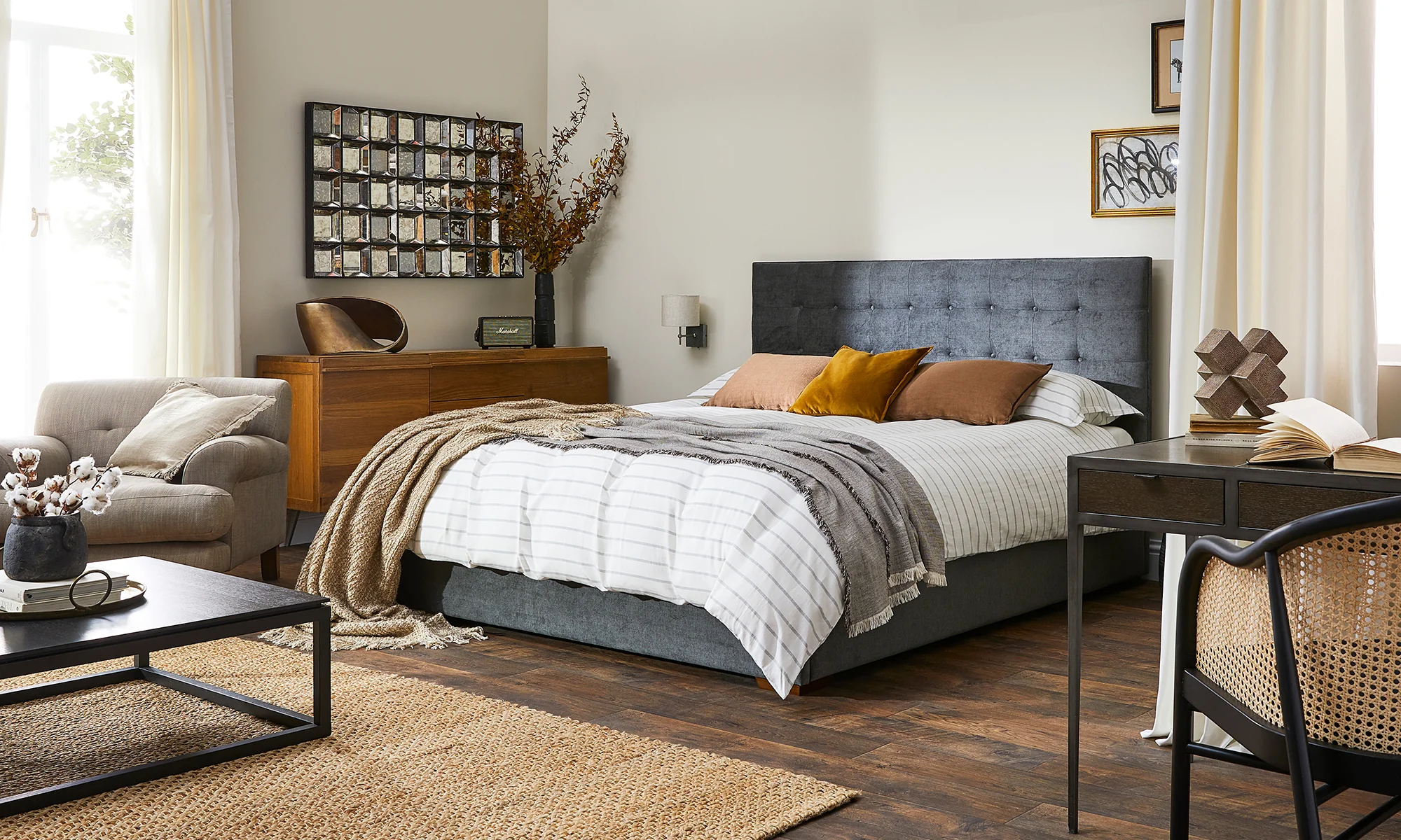 The Yorke features a premium quality upholstered buttoned back headboard in a neat square design.